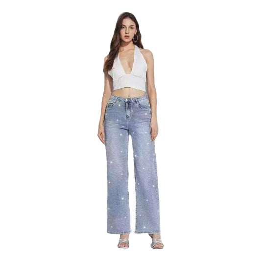 Angel Shopping Γυναικείο Τζιν Παντελόνι Wide Leg με Στρας Μπλε