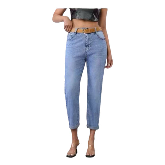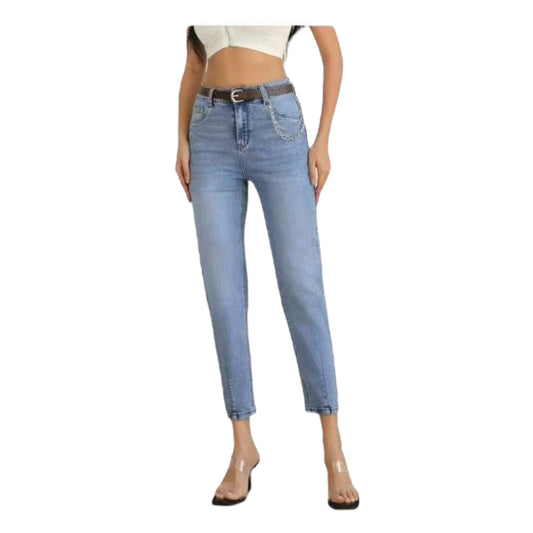 Miss Good Γυναικείο Τζιν Παντελόνι Mom Fit με Ζώνη & Αλυσίδα Μπλε