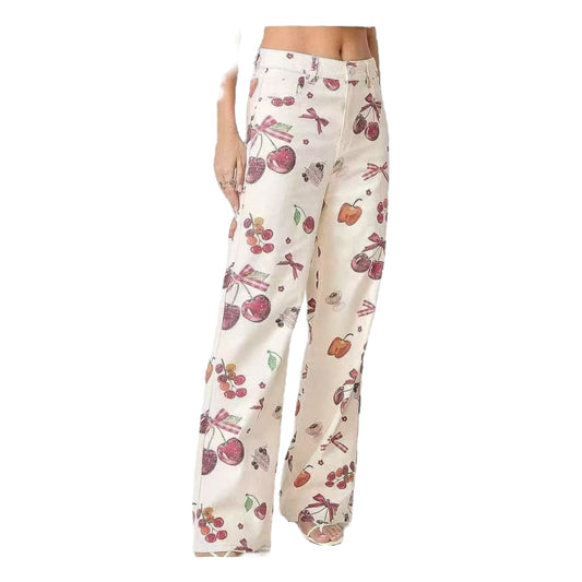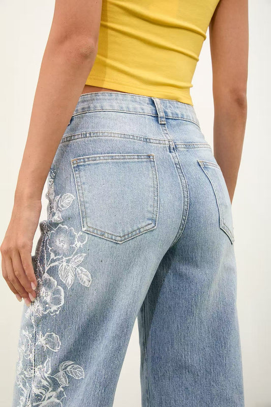 ADORO Women's Baggy Jeans with Floral Pattern Blue