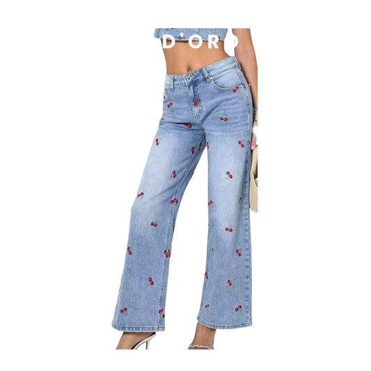 ADORO Γυναικείο Τζιν Παντελόνι Wide Leg Κεράσια Μπλε