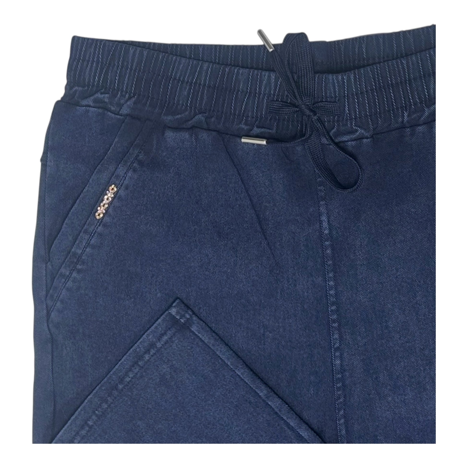 Γυναικείο τζιν παντελόνι σε δύο αποχρώσεις, μαύρο και μπλε. Διαθέτει ελαστική μέση με κορδόνι και τσέπες με φερμουάρ, προσφέροντας πρακτικότητα και μοντέρνο στυλ. Το ελαστικό ύφασμα με βισκόζη και ελαστάνη εξασφαλίζει άνεση και καλύτερη εφαρμογή στην καθημερινή χρήση. Ιδανικό για casual εμφανίσεις.