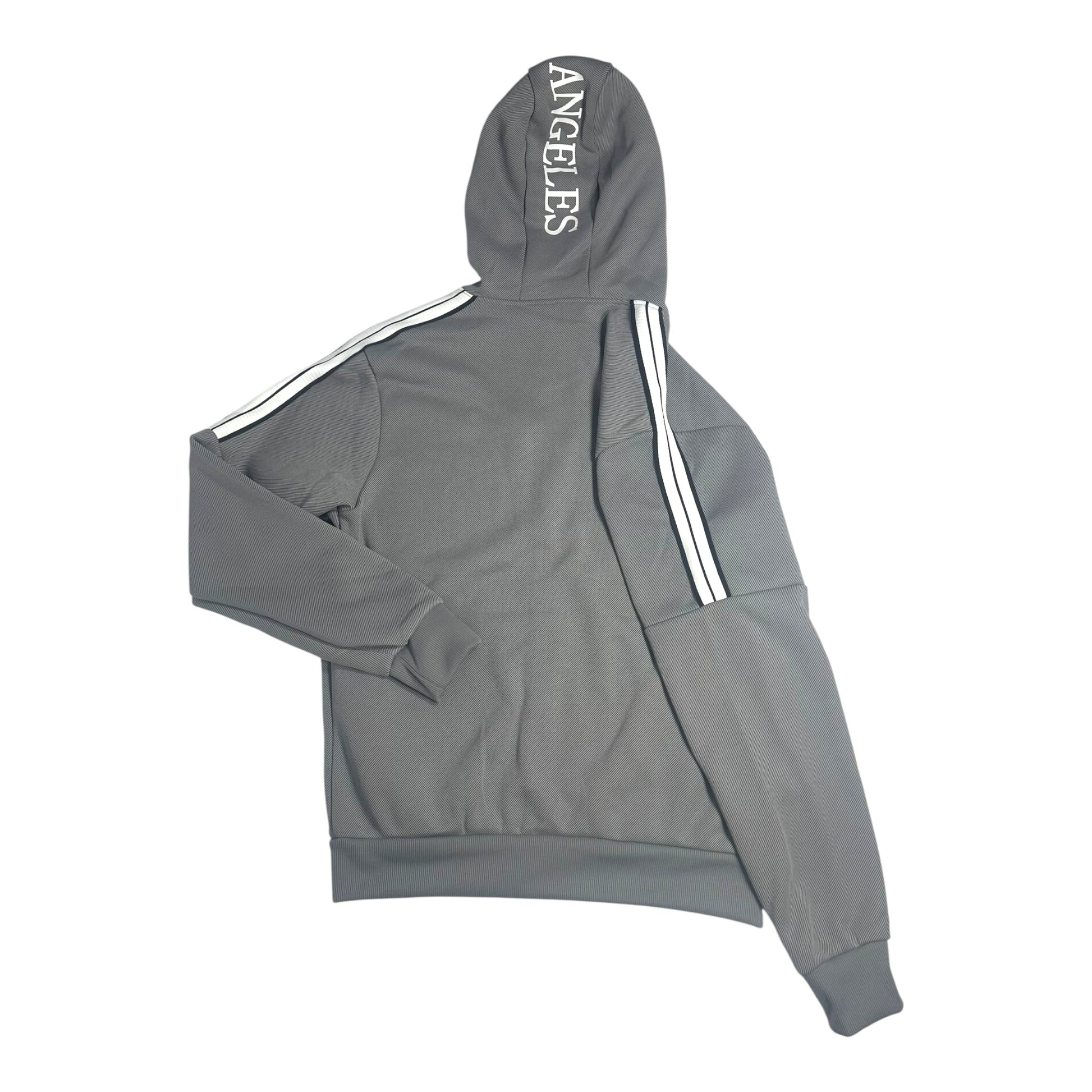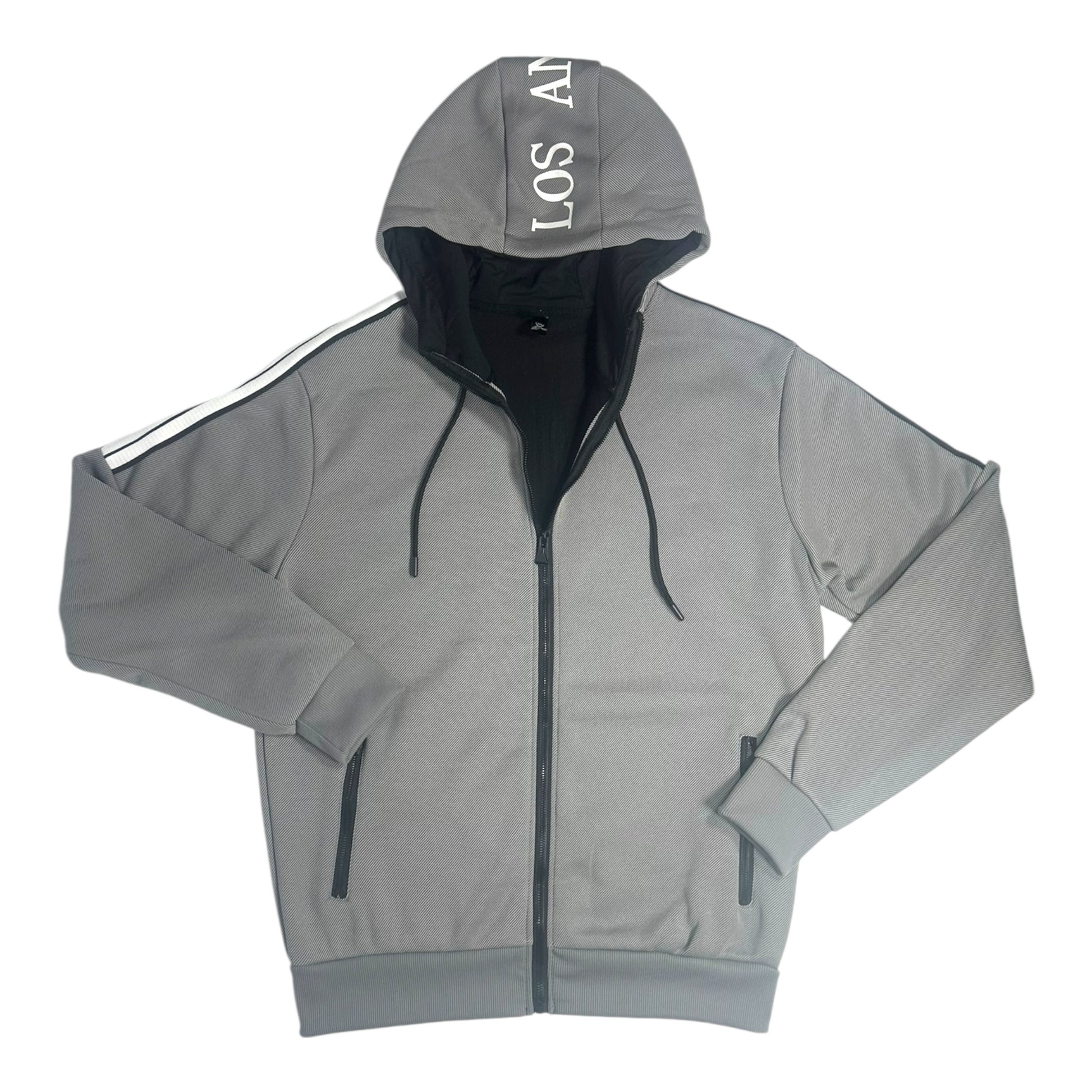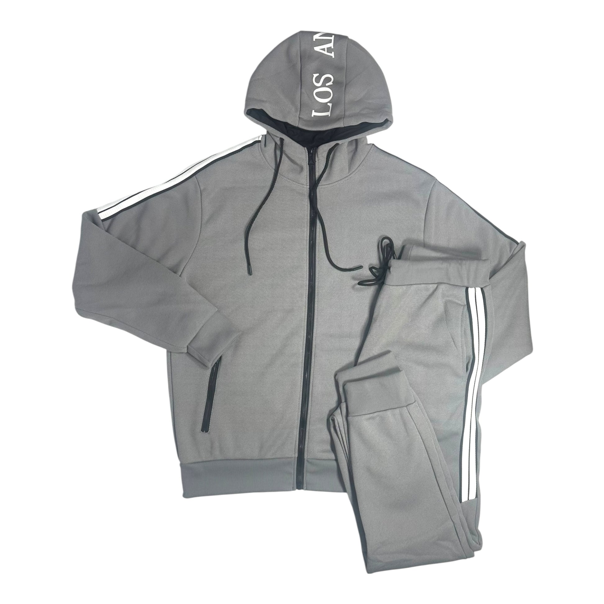 Ανδρικό σετ φόρμας της εταιρίας ANGEL SHOPPING σε σκούρο γκρι χρώμα. Το σετ αποτελείται από ζακέτα με κουκούλα και φερμουάρ, καθώς και παντελόνι με λάστιχο στη μέση και κορδόνι ρύθμισης για άνετη εφαρμογή. Διαθέτει μοντέρνες λεπτομέρειες όπως λογότυπο “LOS ANGELES” στην κουκούλα και πλαϊνές ρίγες στο παντελόνι.