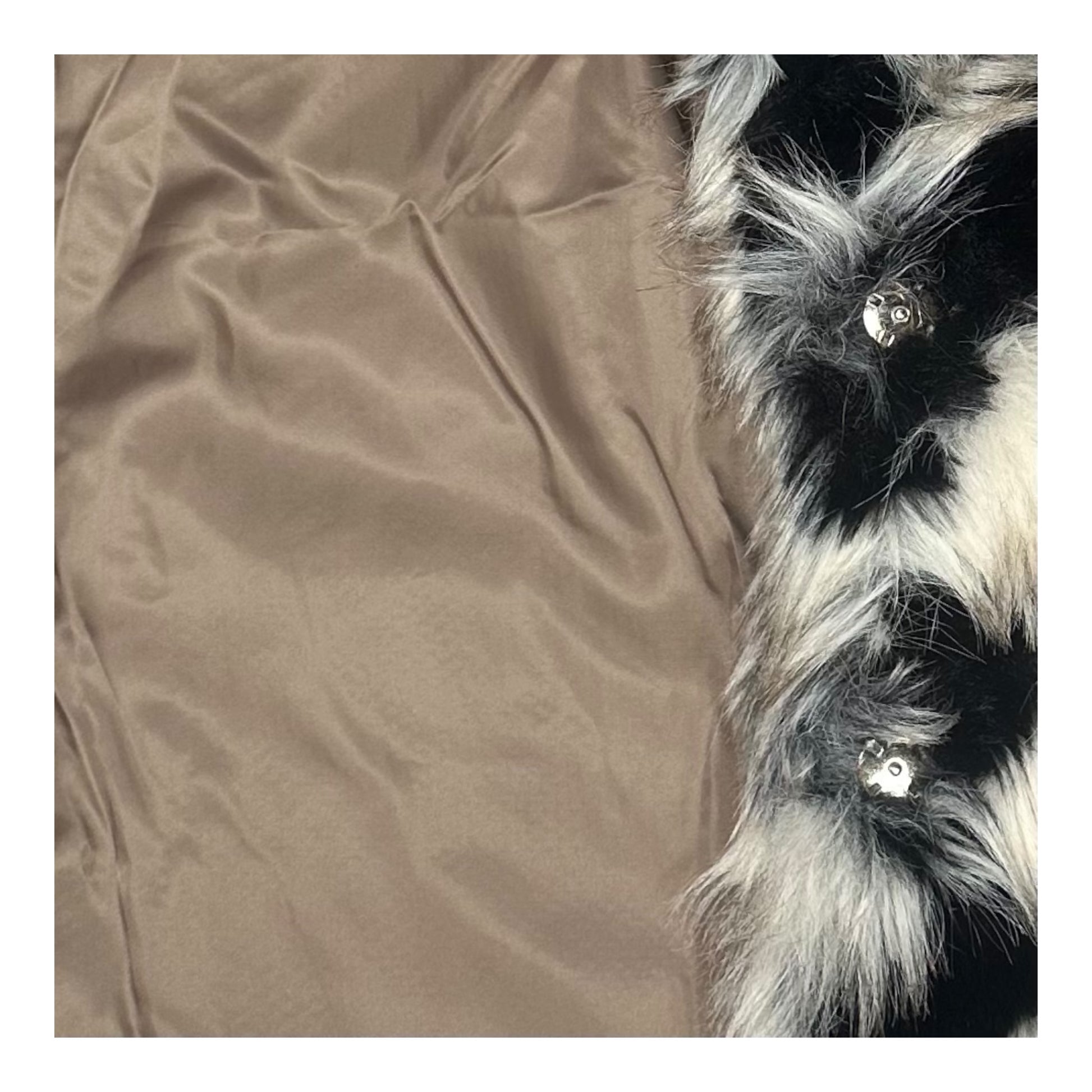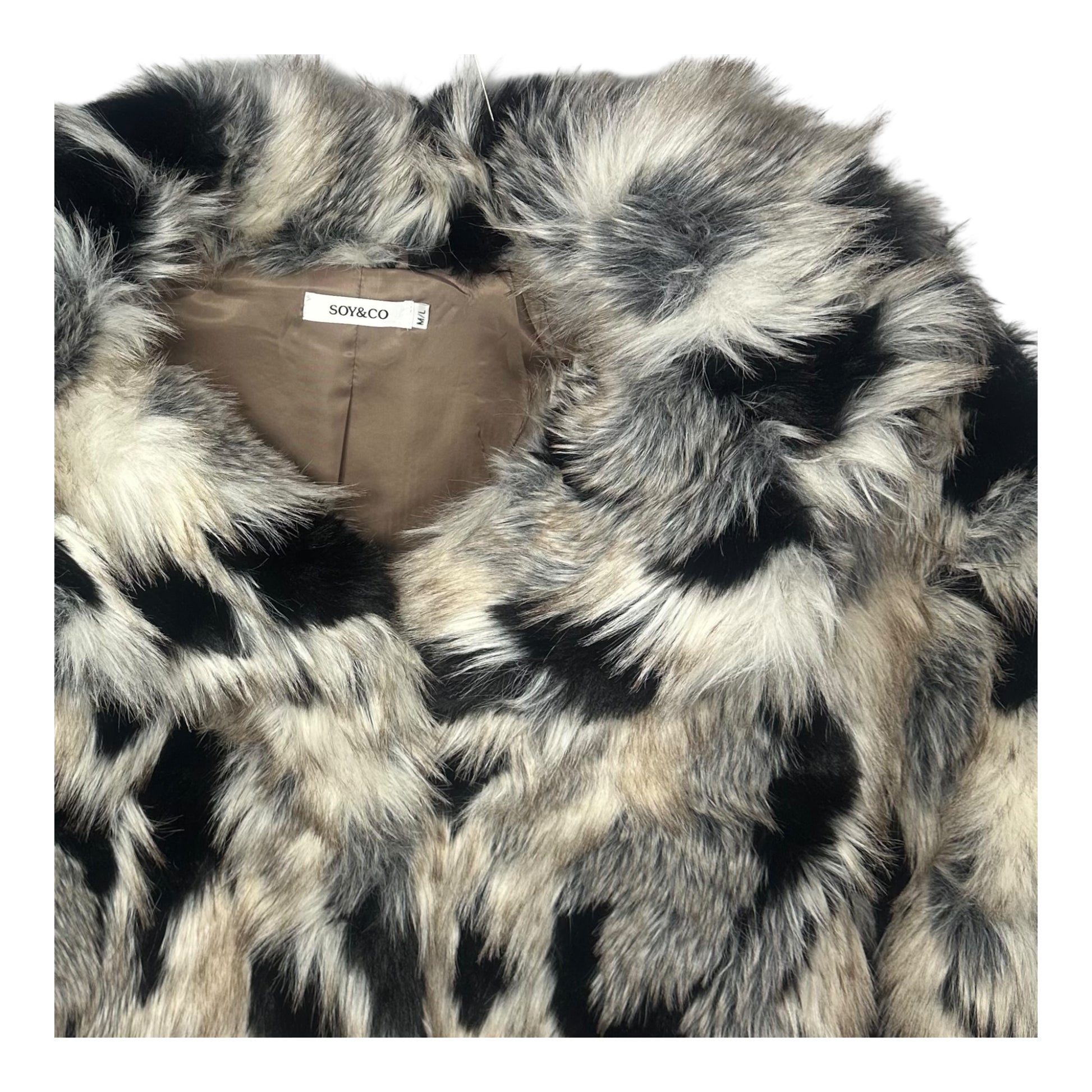 Γυναικείο τζάκετ με οικολογική γούνα, σε εντυπωσιακό σχέδιο με μπεζ, γκρι και μαύρες αποχρώσεις. Προσφέρει μοναδικό στυλ και ζεστασιά, ιδανικό για τις χειμερινές εμφανίσεις σας.