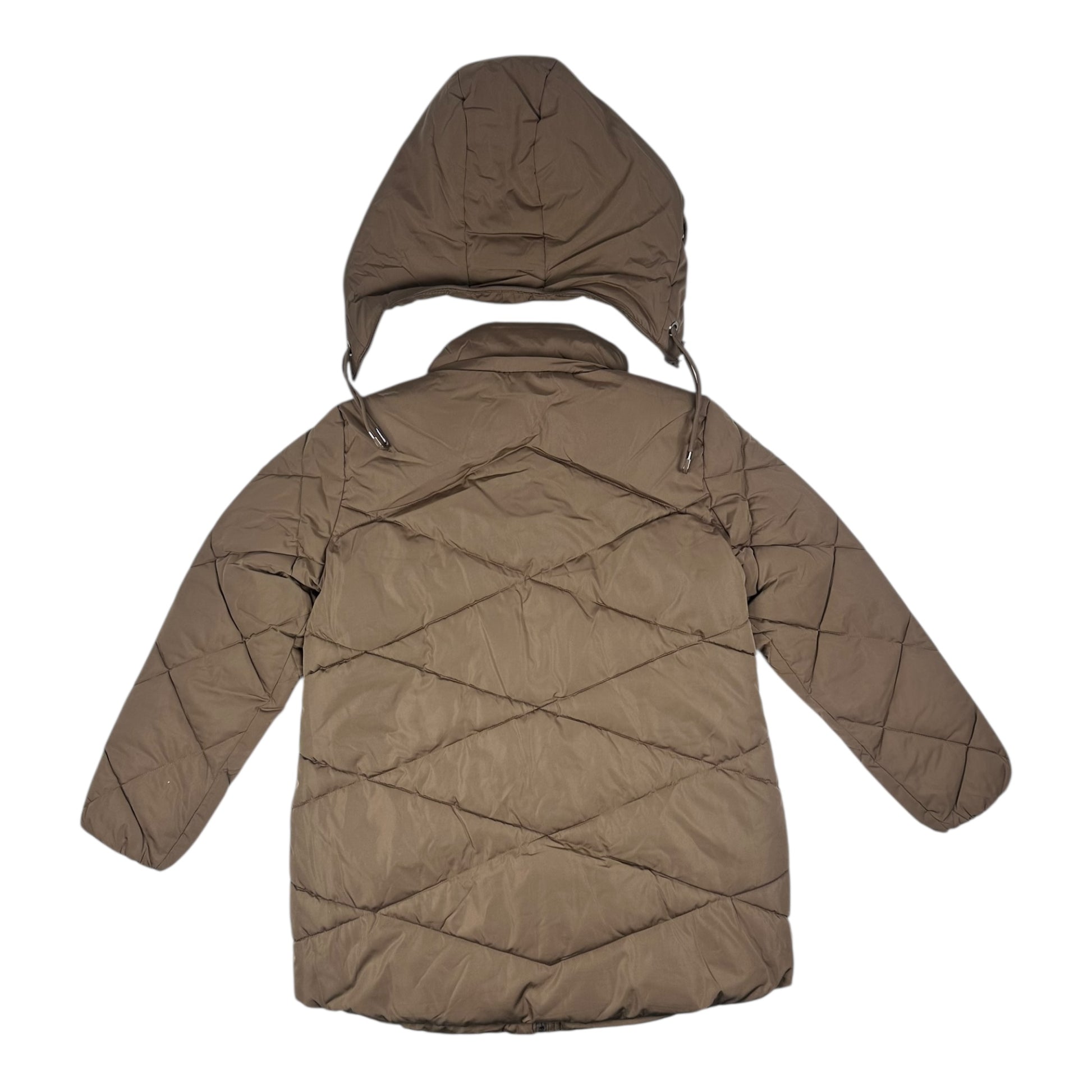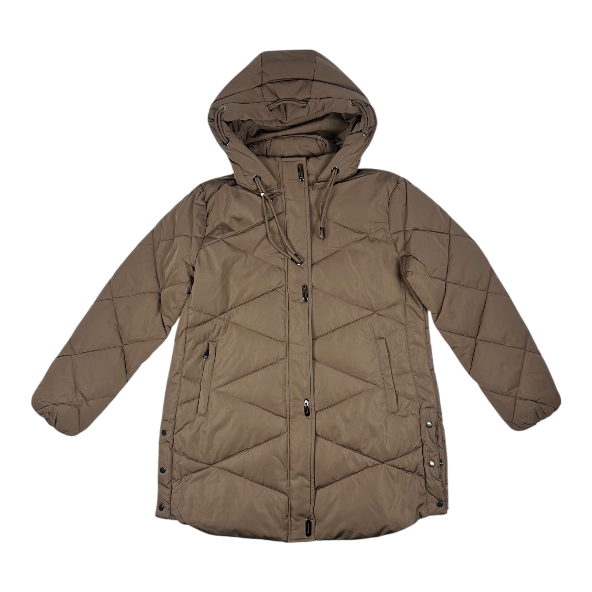 Γυναικείο μακρύ μπουφάν, ιδανικό για τις κρύες μέρες του χειμώνα. Διαθέτει αποσπώμενη κουκούλα με κορδόνια και πρακτικές τσέπες με φερμουάρ στο μπροστινό μέρος. Το διαγώνιο καπιτονέ σχέδιο χαρίζει μοντέρνο στυλ και εφαρμογή που αναδεικνύει τη σιλουέτα, ενώ τα πλαϊνά κουμπιά στο κάτω μέρος προσφέρουν επιπλέον άνεση στις κινήσεις. Διατίθεται σε δύο αποχρώσεις: μαύρο και καφέ.