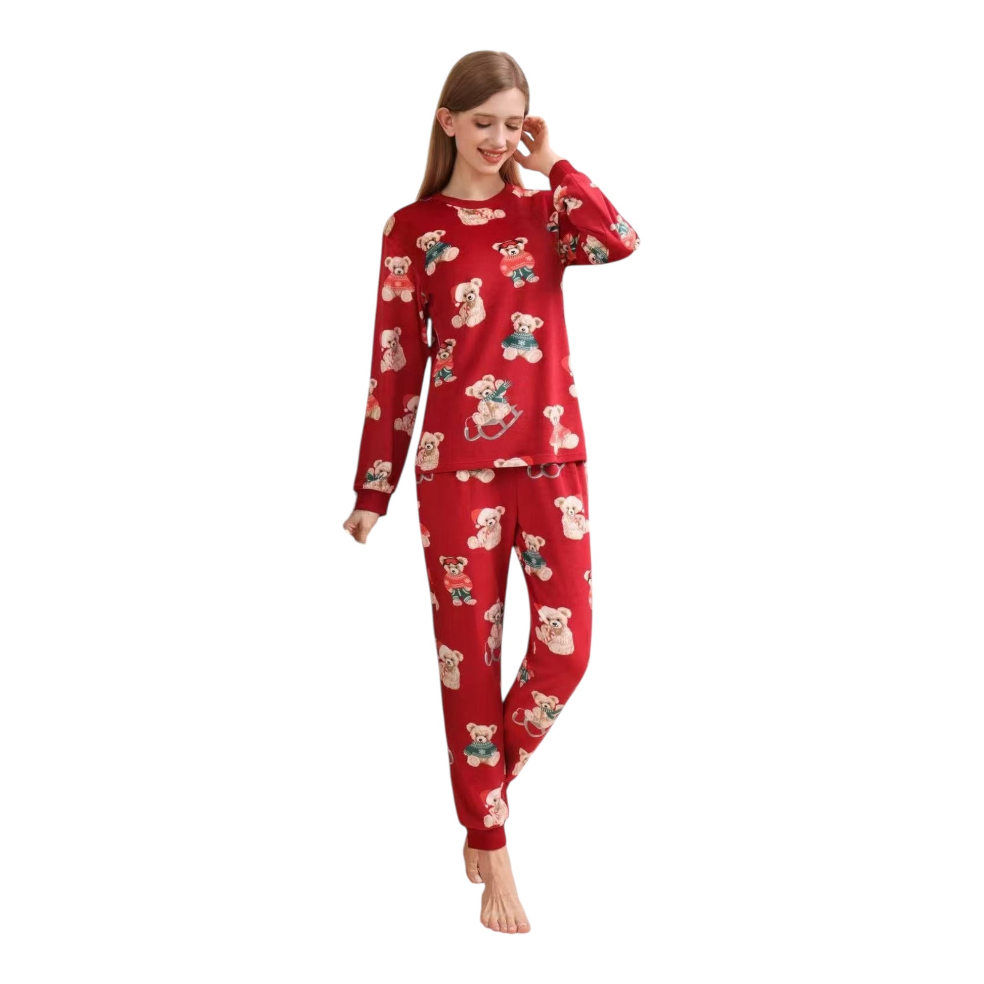 Ζεστή και άνετη γυναικεία πυτζάμα, ιδανική για τις κρύες νύχτες του χειμώνα. Κατασκευασμένη από βελούδινο ύφασμα Silver Fox Fleece, προσφέρει απαλή αίσθηση και εξαιρετική θερμότητα. Το σετ περιλαμβάνει μπλούζα με μακριά μανίκια και παντελόνι, σε χαρούμενο σχέδιο με αρκουδάκια — ιδανικό για την περίοδο των Χριστουγέννων.
