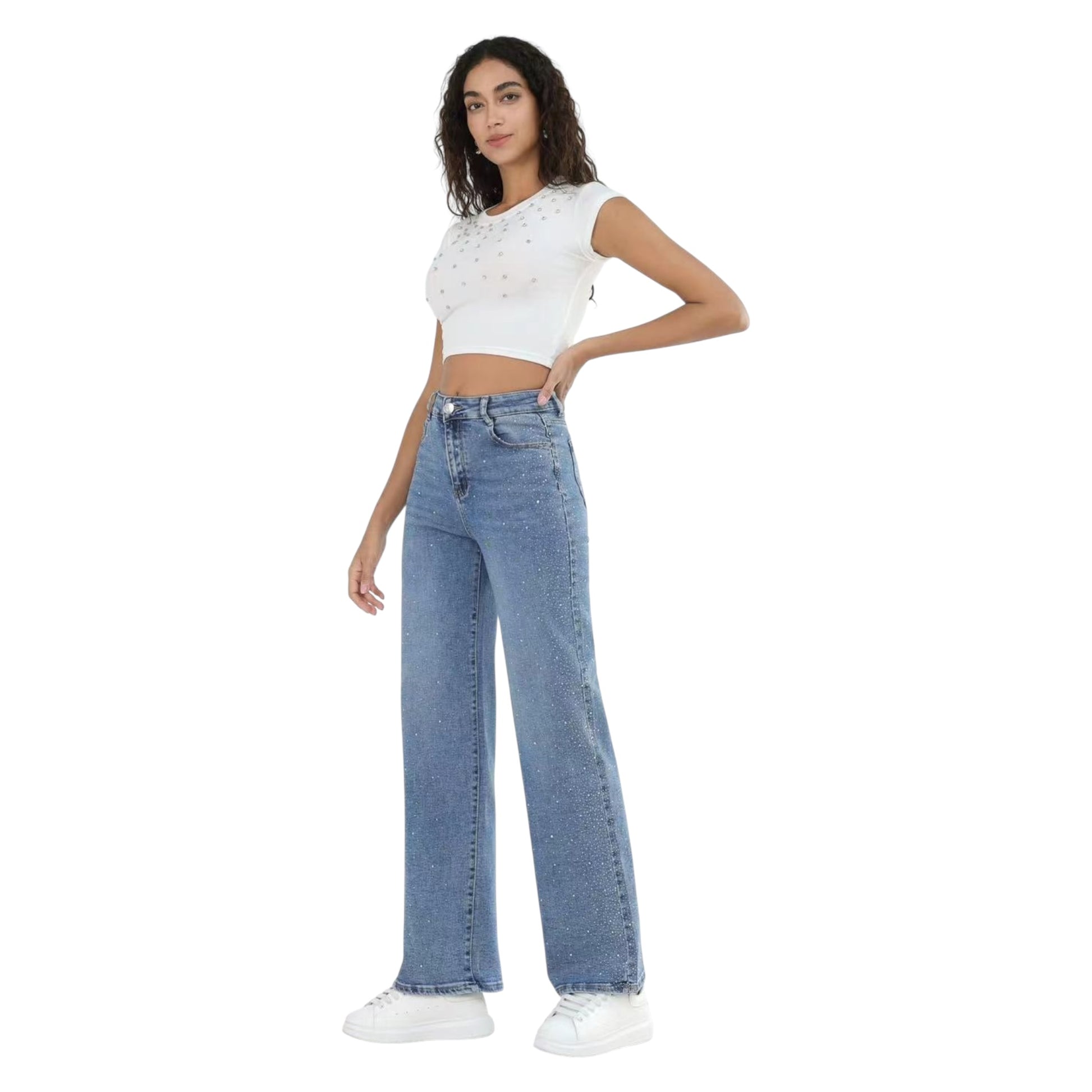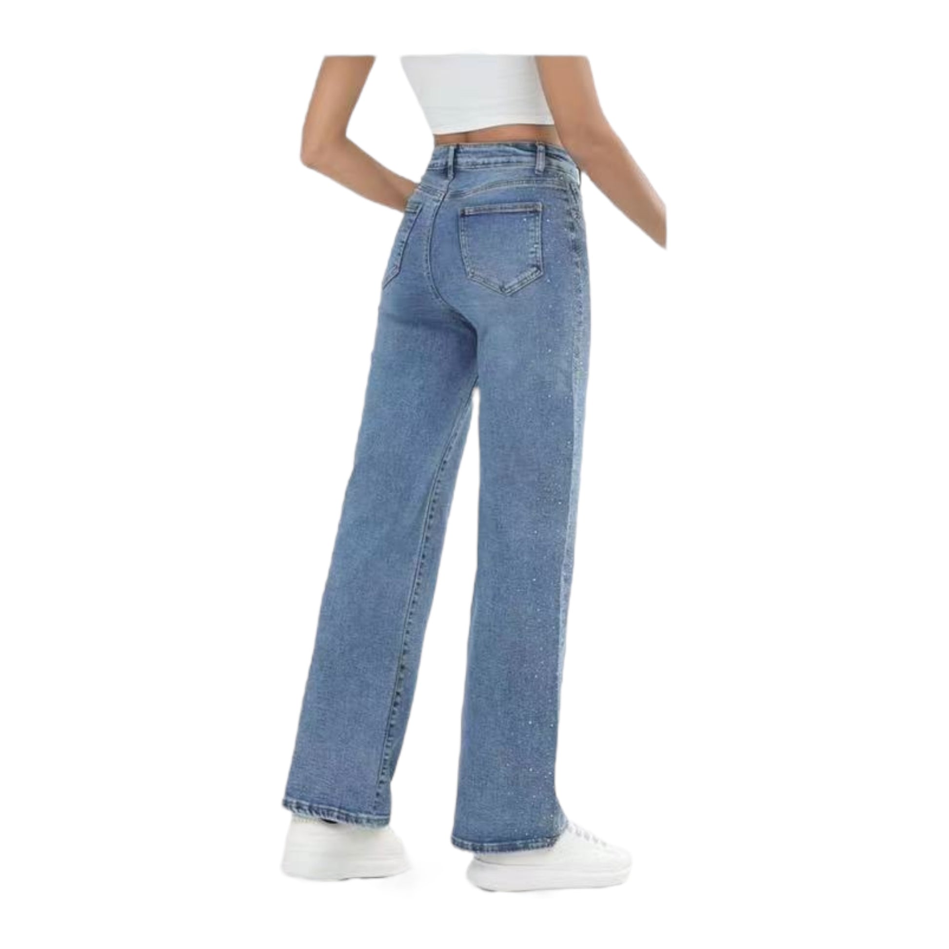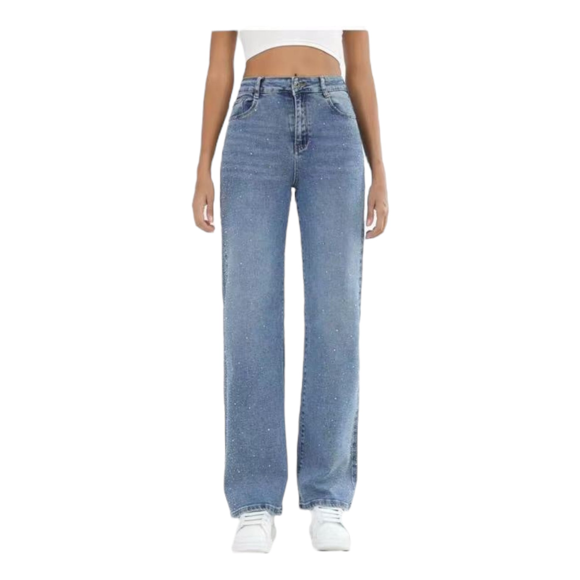 Το γυναικείο τζιν παντελόνι MISS GOOD MG7187 σε φαρδιά ίσια γραμμή (Straight Fit) συνδυάζει την άνεση με την πολυτέλεια, χάρη στη διακόσμηση με διακριτικά strass σε όλη την επιφάνειά του. Η ψηλόμεση εφαρμογή του αναδεικνύει τη μέση και προσφέρει σταθερότητα, ενώ η άνετη γραμμή στα μπατζάκια χαρίζει στυλ και ελευθερία κινήσεων.